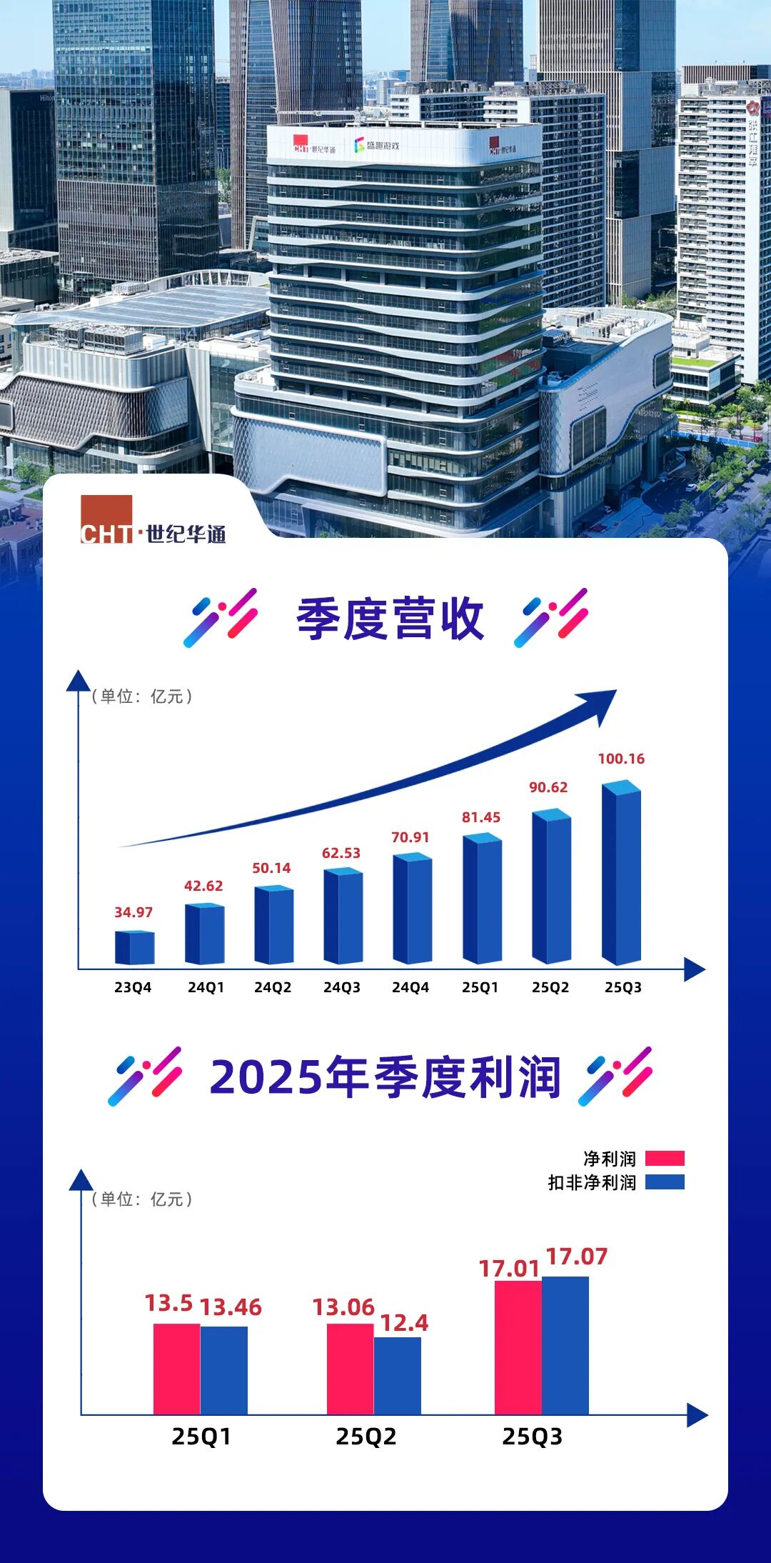世纪华通(002602.sz)实现营收100.16亿元,同比增长60.19%;净利润17.01亿元,同比增长163.78%;扣非后净利润17.07亿元,同比增长171.27%——上述成绩单来自10月30日公司披露的2025第三季度报告。至此,世纪华通不仅达成了季度营收“十连升”,单季度营收更是第一次突破百亿规模,展示出可持续的强劲增长态势。